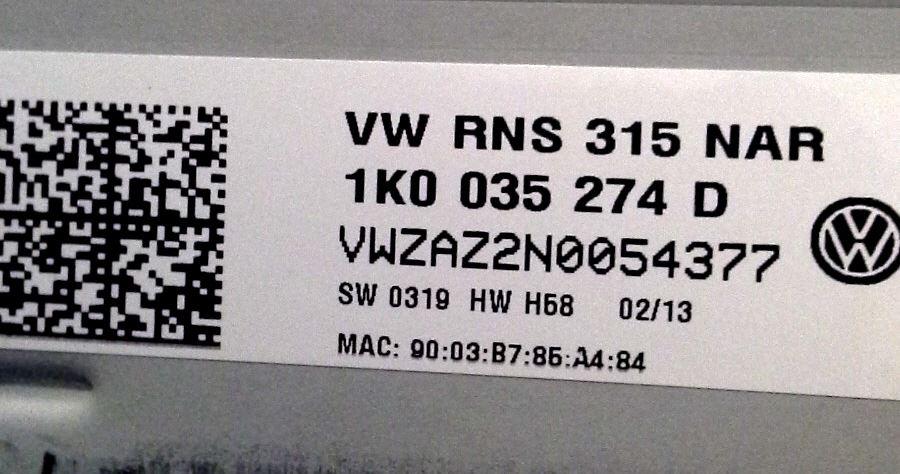 VW Radio Code RNS 315 VWZAZ2N 1K0 035 274 D